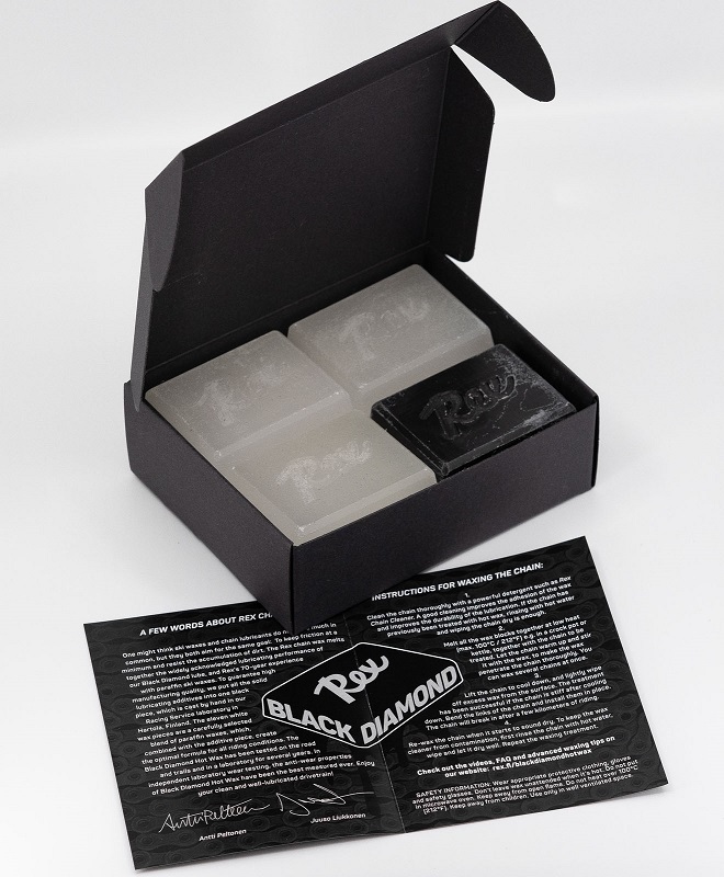 Už predtým dôkladne testovanú a vysoko účinnú technológiu aditív Black Diamond sme pretransformovali na pevný voskový základ. Aby sme zabezpečili vysokú kvalitu výroby vložili sme všetky prísady Black Diamond do jedného čierneho kusu, ktorý je ručne odlievaný v našom laboratóriu na vývoj produktov v Hartole. Tento čierny aditívny kus si možno predstaviť ako fľaštičku maziva na reťaz Black Diamond v pevnej forme. Jedenásť bielych parafínových blokov Rex, starostlivo vybraných pre ich voskovú zmes, je kombinovaných s aditívnym blokom, pre zaručenie najlepšieho mazacieho výkonu na trhu. Roztopením všetkých kusov (zmes 11+1) dohromady získate voskovú zmes, ktorá dokonale funguje za všetkých podmienok.